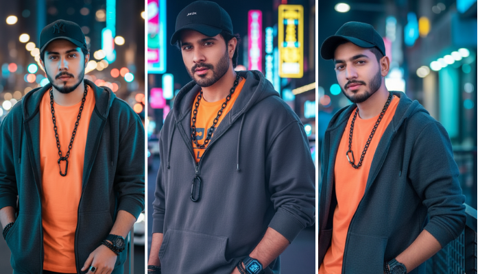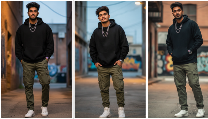 The man is styled in a oversized streetwear hoodie, giving him a relaxed yet fashionable silhouette. The fabric appears thick