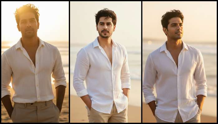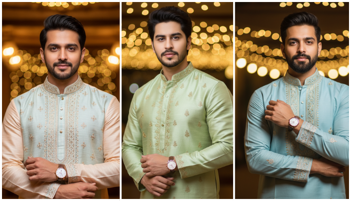 The man is dressed in a traditional Indian kurta, styled with graceful folds and a soft fabric texture that