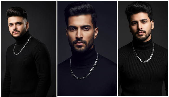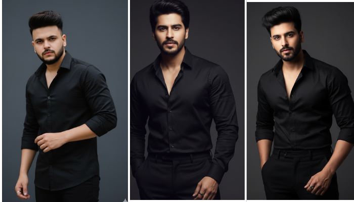 The man is dressed in a refined all-black outfit, conveying sophistication and minimalism. His black shirt is crisp and well-fitted,