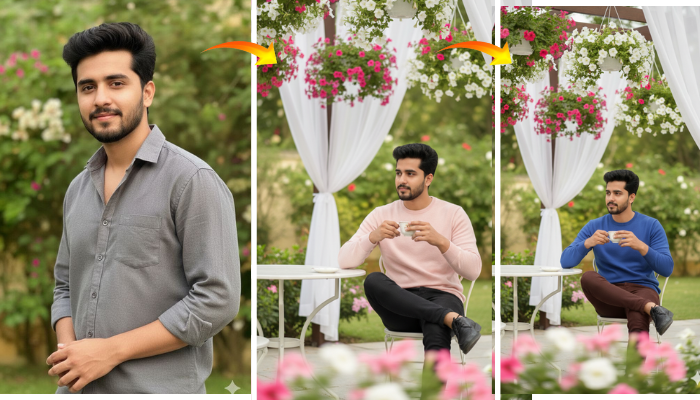 This concept captures an ultra-photorealistic, cinematic portrait of an elegant young man seated outdoors in a beautifully styled garden or