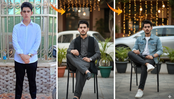 This concept portrays a stylish young man seated at a modern outdoor café, captured in a composed and cinematic fashion.