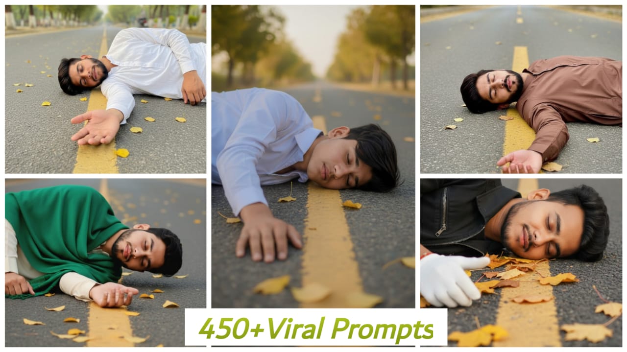 Copy Prompt “Make this picture look like a young man sleeping on a road. The yellow line is also visible.The boy’s face is facing the camera and a hand is also shown reaching towards the camera. Yellow leaves have fallen from the trees here and there.The face should look exactly like this.”