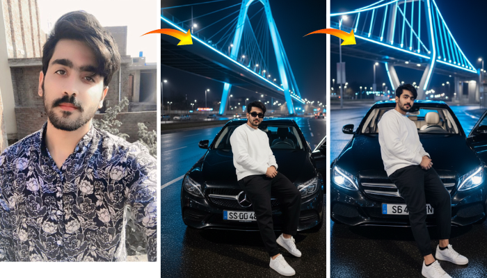 A Night Scene Charged With Urban Elegance Set beneath a futuristic illuminated blue bridge, the ambiance is cool, modern, and