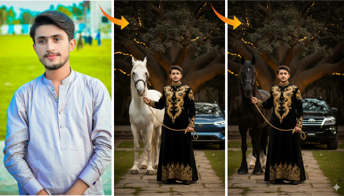 Copy Prompt A hyper-realistic full-body portrait of a regal young man standing confidently on a stone courtyard surrounded by soft green grass with a slight blur effect for cinematic depth.He is dressed in an elegant black traditional royal robe richly embroidered with golden dragon and phoenix patterns. His hair style as a uploaded photo, and he holds a golden rope attached to a majestic black Shire horse standing calmly behind him. In the background, a black Toyota Fortuner SUV is parked gracefully, slightly blurred for realism. Behind them stands a large, ancient black tree with wide branches and subtle glowing edges, adding a mysterious and powerful atmosphere. The entire background is softly blurred with dark tones, creating a dramatic contrast that highlights the subject, horse, and car. The lighting is cinematic – soft, moody, and golden around the details, emphasizing royalty, power, and elegance.Dont Change The Face